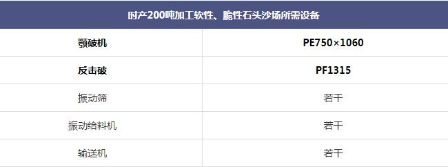 b、以时产200吨加工能力为例,解决软性、脆性矿石(青石、石膏、青石、风化岩、煤矸石等)的沙场所需机械如下: